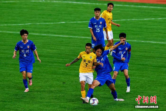 4月12日,掀幕战上黄石队球员(中)取荆州队球员(左)角逐中拼抢。当日,2026年湖北省会市脚球联赛(“楚超”) 正在湖北黄石落幕。那项笼罩齐省17个市州、同146场对于绝的脚球嘉会,以“知心湖北 ‘脚’梦飞腾”为大旨,旨正在完毕“以赛营乡、以赛兴业、以赛惠平易近”。中新社记者 弛畅 摄